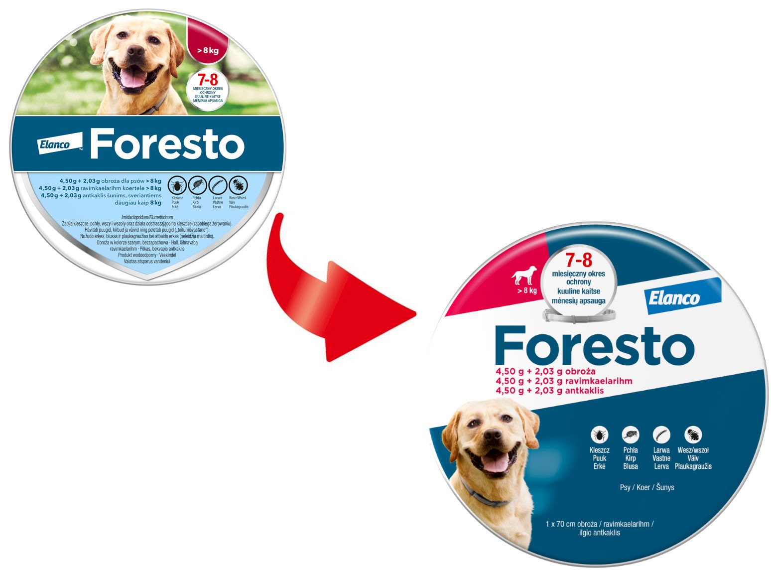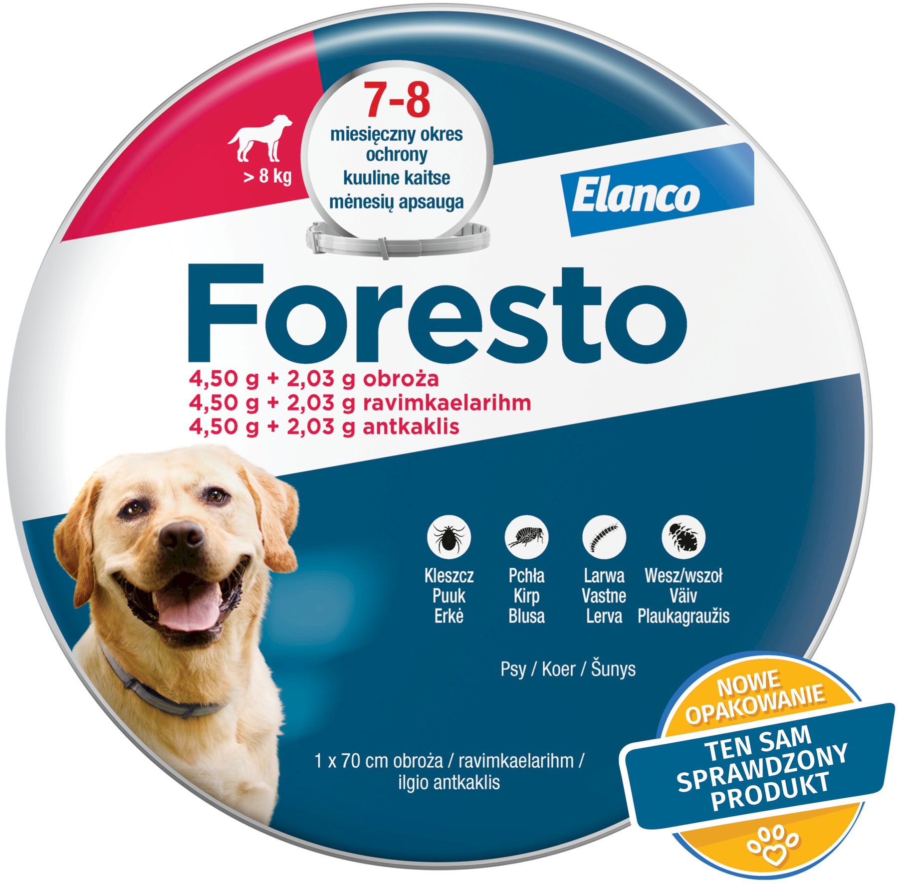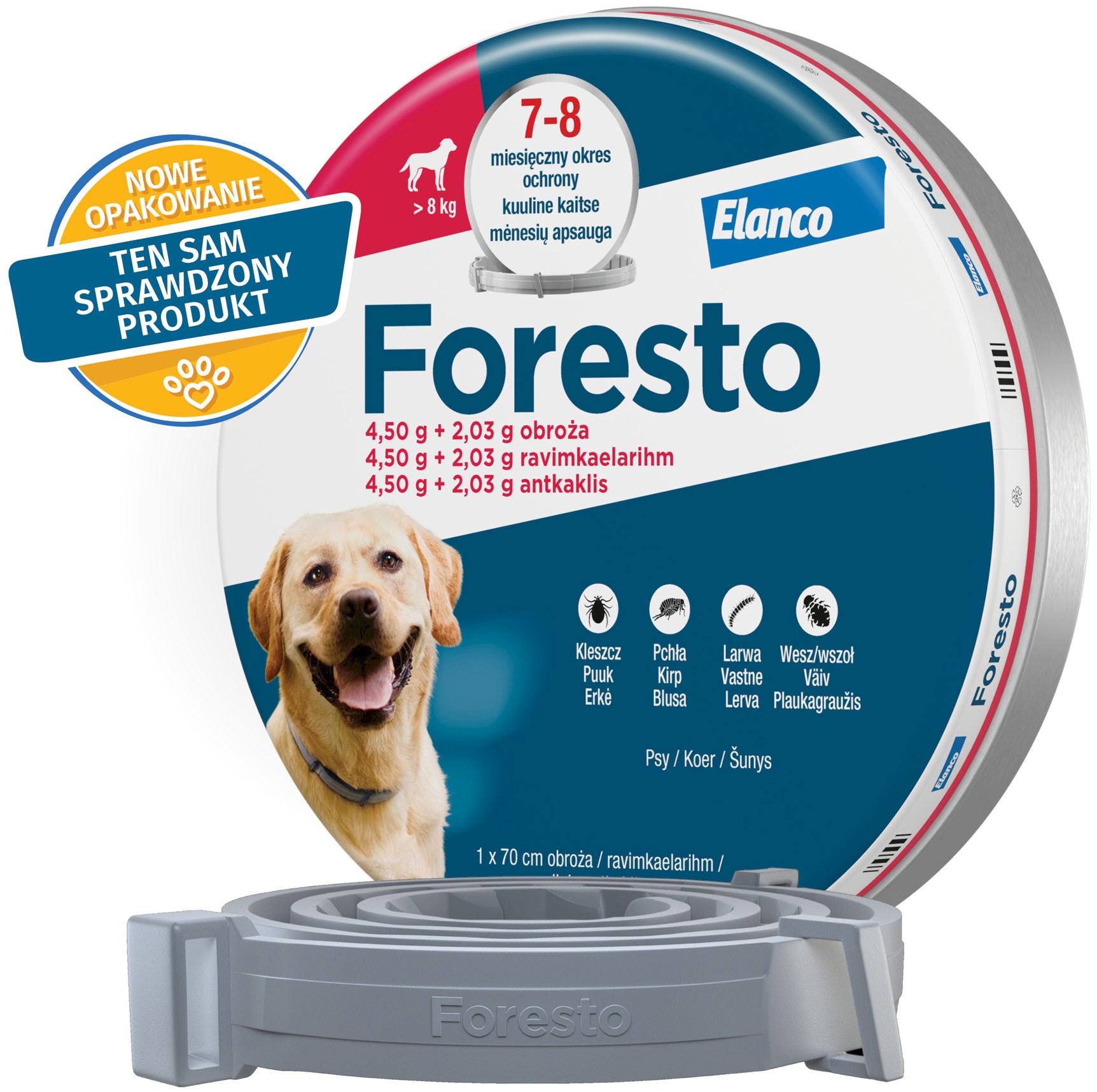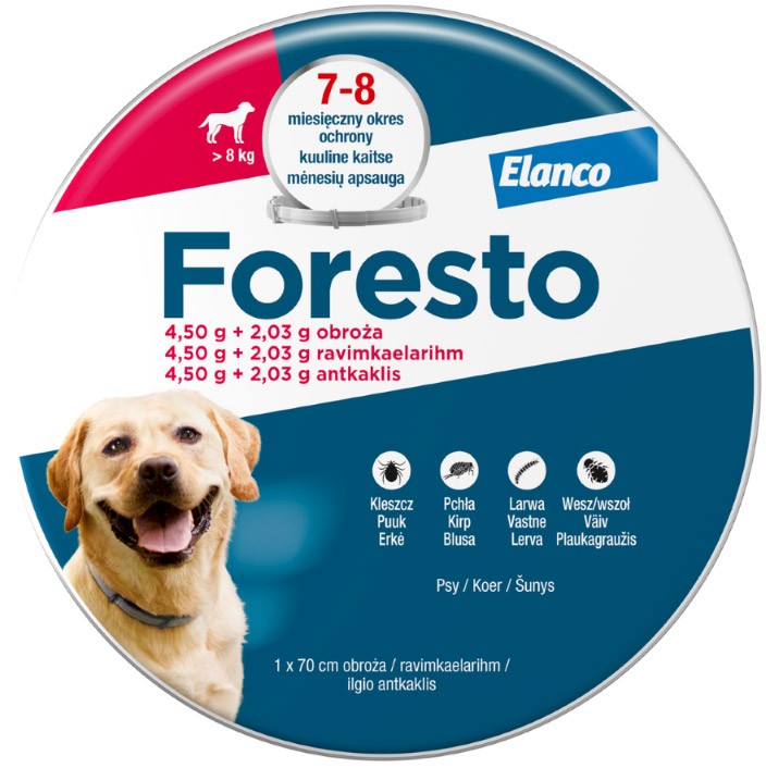 - Obroża Foresto - zwalcza i zapobiega inwazji pcheł, kleszczy, wszy, larw u psów o wadze powyżej 8kg.