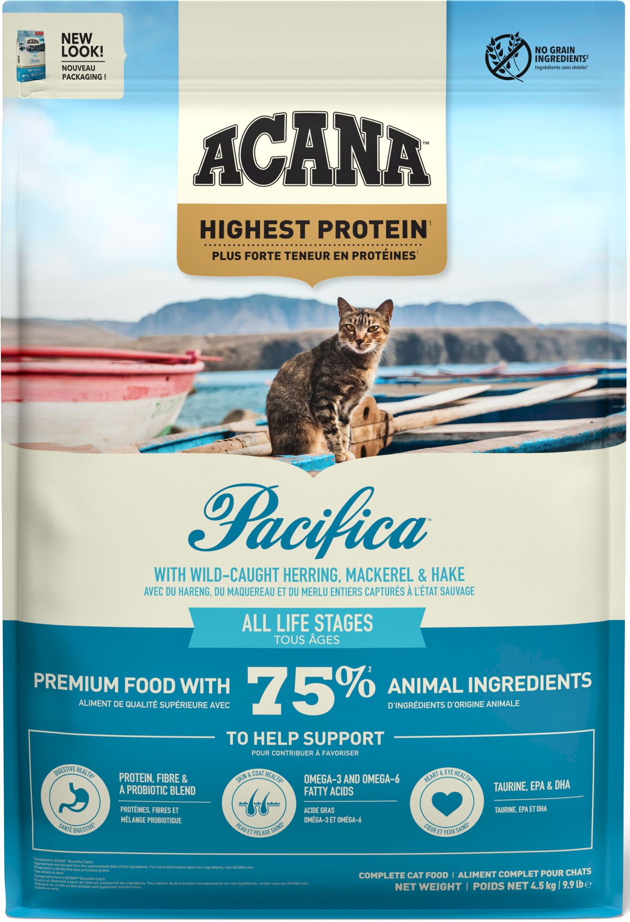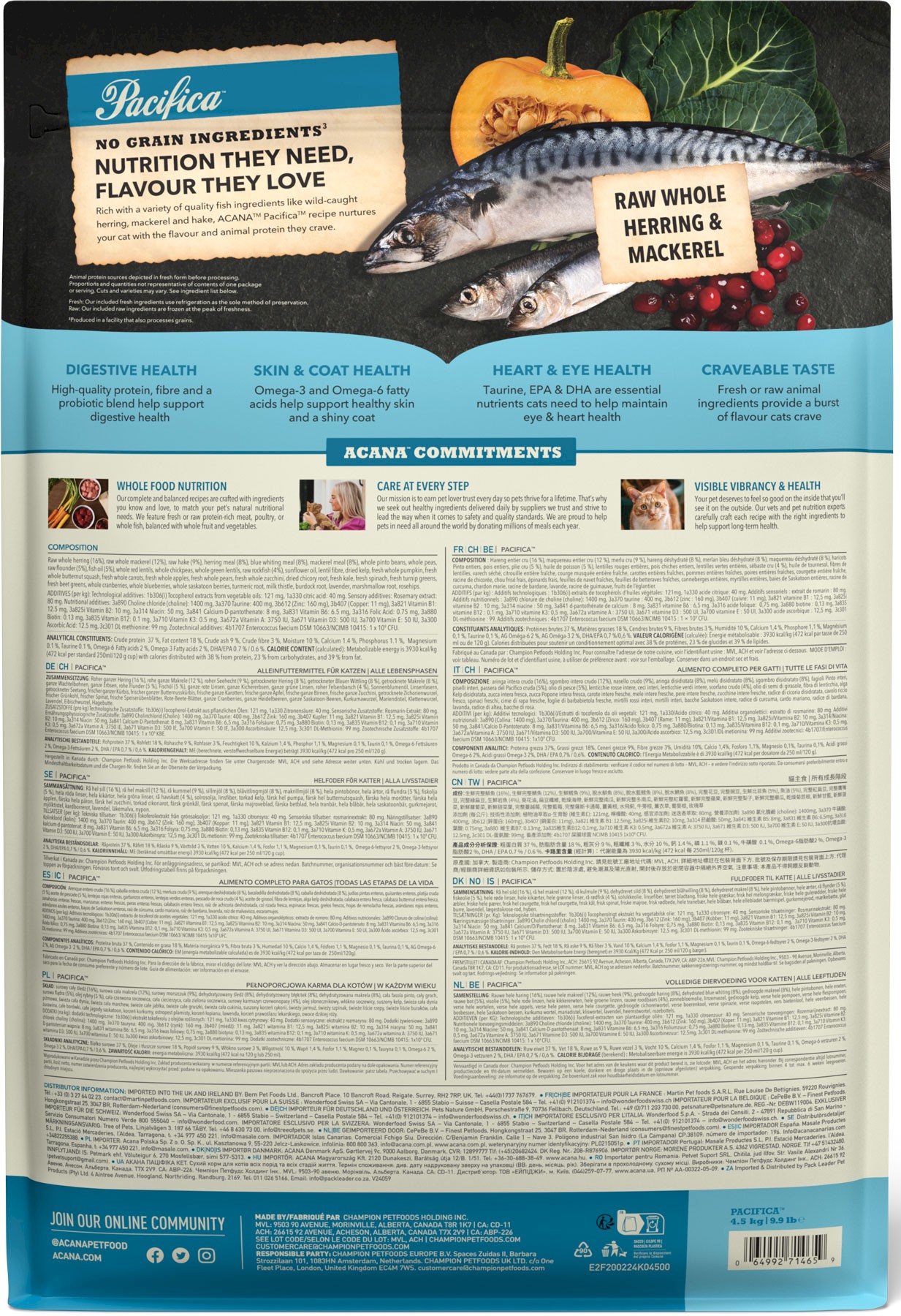 Surowy cały śledź pacyficzny (14%), surowa cała makrela pacyficzna (13%), surowy cały morszczuk (9%), dehydratyzowany śledź (8%),