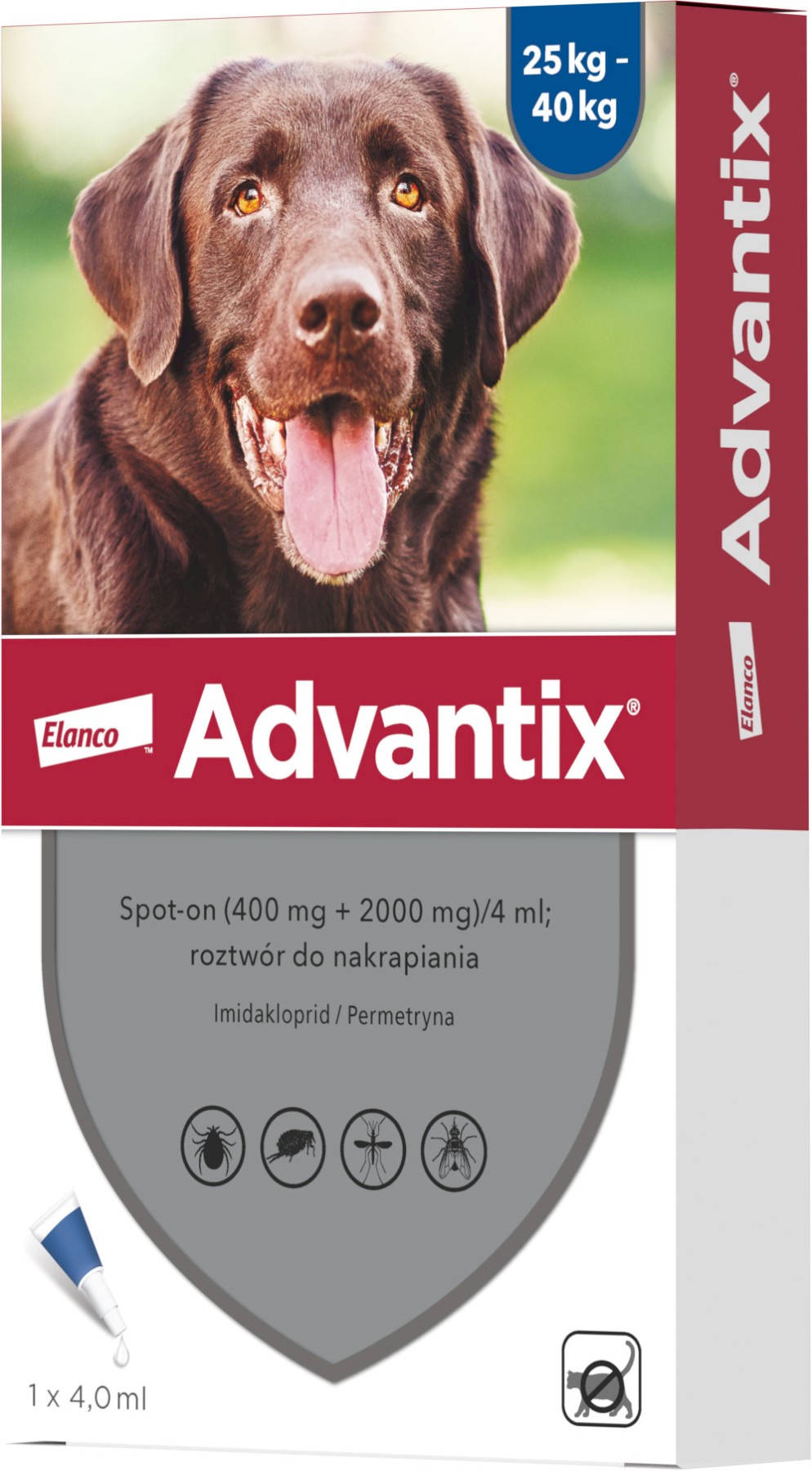 - Advantix SPOT-ON - roztwór do nakrapiania na skórę przeznaczony do zwalczanie kleszczy, pcheł u psów o masie 25-40kg.