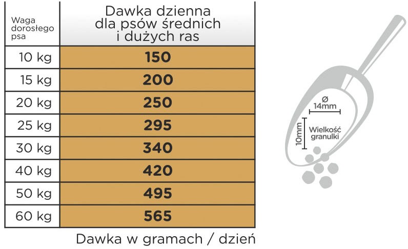 - Kompletna, zbilansowana karma specjalnie opracowana dla metabolizmu psów średnich i dużych ras (powyżej 10kg wagi).