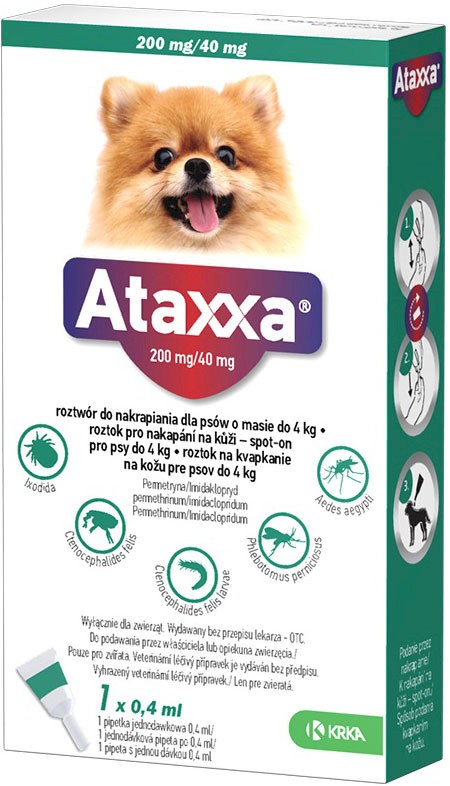 - ATAXXA - roztwór do nakrapiania na skórę przeznaczony do zwalczanie kleszczy, pcheł, komarów i much u psów o masie do 4kg.