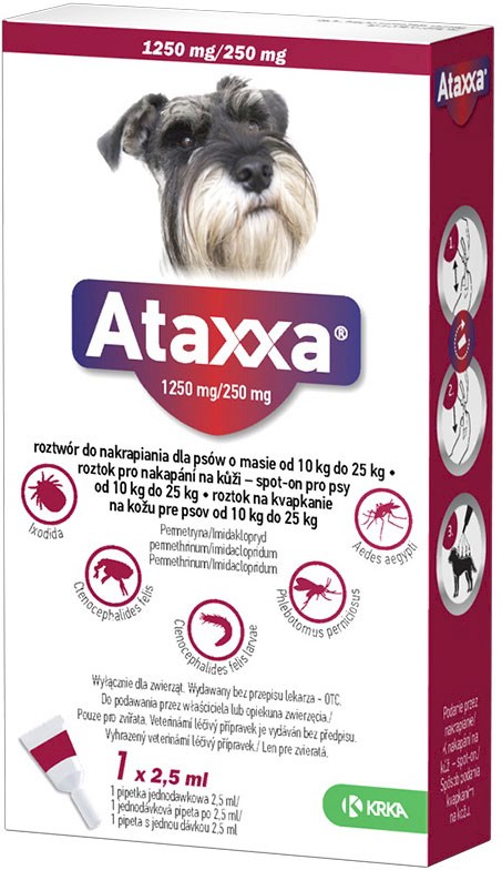 - ATAXXA - roztwór do nakrapiania na skórę przeznaczony do zwalczanie kleszczy, pcheł, komarów i much u psów o masie 10-25kg.