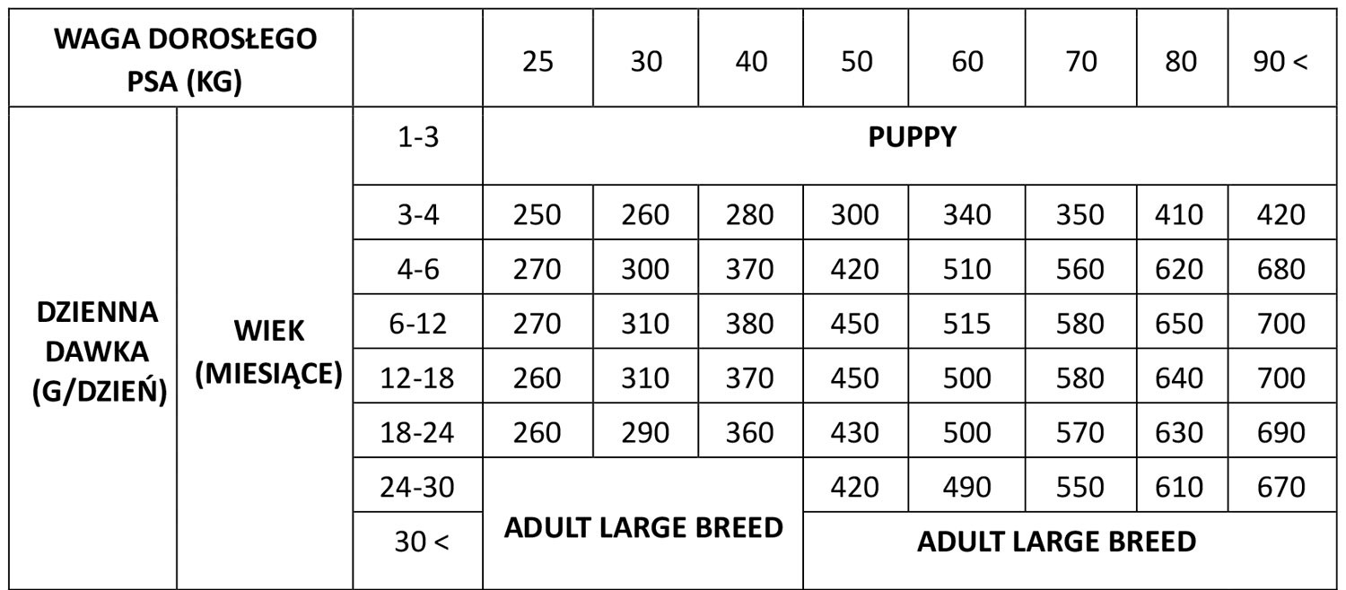 - Karma bezzbożowa z Kaczką dla psów młodych dużych ras (powyżej 25kg wagi).