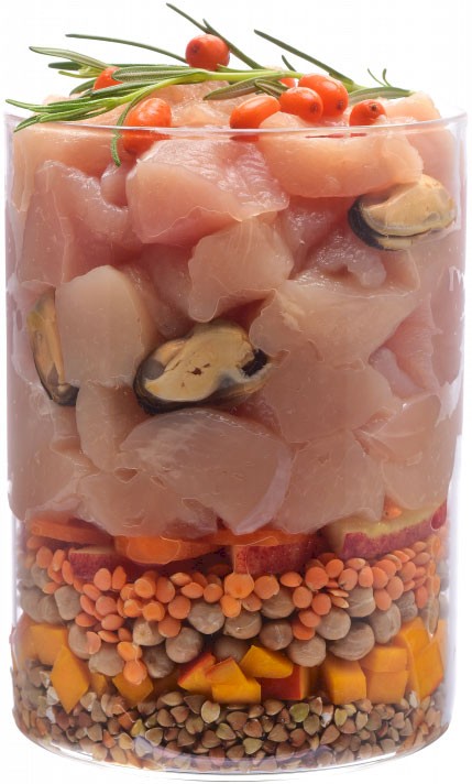 świeży kurczak (60%), groch, gryka (6%), suszone jabłka, dynia (4%), czerwona soczewica, tłuszcz z kurczaka (konserwowany tokoferolami), olej z łososia (2,5%), naturalne aromaty, suszone wodorosty morskie (Ascophyllum nodosum, 1%), suszone skorupki jaj (0,5%), białko z rzęsy (Lemna) (0,5%), suszony rokitnik (0,2%), suszony korzeń imbiru (0,1%), suszone jagody (0,1%), suszony rozmaryn (0,1%), suszona żurawina (0,1%), suszony tymianek (0,1%),