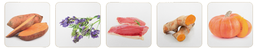 Bataty 43%, kaczka 34% (świeża kaczka 26%, suszona kaczka 8%), białko grochu, lucerna 2%, dynia 2%, bulion z kaczki 2%, suszone całe jaja, olej rybny, składniki mineralne (elektrolity: wodorowęglan sodu, chlorek potasu, chlorek sodu), topinambur, mannanooligosacharydy (prebiotyk) 0,2%, fruktooligosacharydy (prebiotyk) 0,2%, jagody aronii, kurkuma 0,08%.