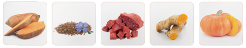 Słodkie ziemniaki 42%, koń 29% (świeży koń 19%, suszony koń 10%), tłuszcz koński 7%, dynia 6%, białko grochu, lucerna, siemię lniane 2%, algi (bogate w DHA*), olej słonecznikowy, minerały, topinambur 0,4%, mannanooligosacharydy (prebiotyk) 0,2%, fruktooligosacharydy (prebiotyk) 0,2%.