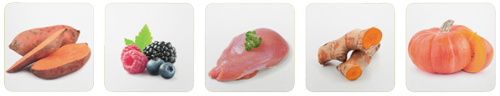 Indyk 36% (świeży indyk 26%, suszony indyk 10%), bataty 33%, ciecierzyca, olej rybi, dynia 5%, lucerna, siemię lniane, bulion z indyka 2%, algi (bogate w DHA*), siarczan glukozaminy 0,4%, metylosulfonylometan (MSM) 0,4%, siarczan chondroityny 0,3%, minerały, kurkuma 0,1%, mannanooligosacharydy (prebiotyk) 0,1%, fruktooligosacharydy (prebiotyk) 0,1%, jeżyny, maliny 0,06%, borówki 0,06%, porzeczki czarne 0,06%, bez czarny, jagody aronii, owoce dzikiej róży, rokitnik zwyczajny, ekstrakt z małży zielonej.