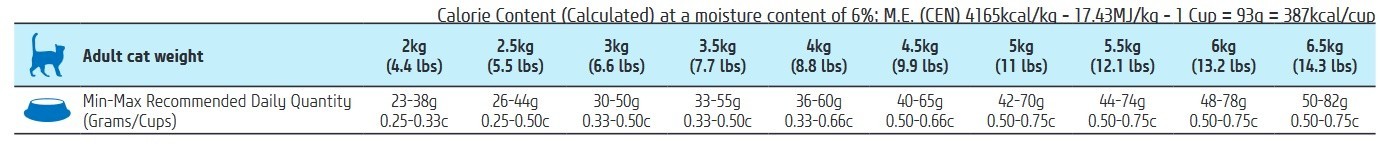 Białko surowe 36%, oleje i tłuszcze surowe 20%, Włókno surowe 1.90%, Wilgotność 8.00%; Popiół surowy 8.10%, Wapń 1.10%; Fosfor 0.90%; Magnez 0.09%; Kwasy tłuszczowe omega-6 3.40%; Kwasy tłuszczowe omega-3 0.90%; DHA 0.50%; EPA 0.30%.
