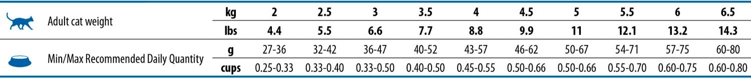 Białko surowe 31%, oleje i tłuszcze surowe 11%, Włókno surowe 6.50%; Wilgotność 8.00%; Popiół surowy 8.20%; Wapń 1.10%; Fosfor 0.90%; Magnez 0.09%; Omega-6 2.00%; Omega-3 0.40%; DHA 0.15%; EPA 0.10%; Tauryna (3a370) 0.18%.