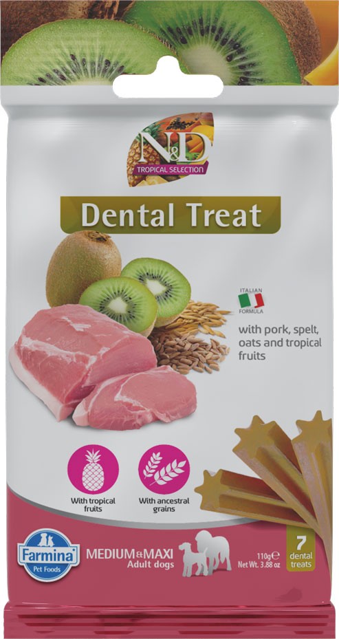 Cechy Farmina Natural & Delicious Dental Treat Tropical Selection Pork, Spelt, Oats & Tropical Fruits Adult Medium & Maxi: