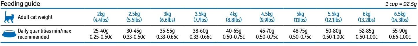 Gluten kukurydziany, ryż, suszone mięso z kurczaka, owies, tłuszcz zwierzęcy, hydrolizowane białka zwierzęce, suszone całe jaja, olej rybny, mączka rybna, chlorek potasu, olej roślinny, węglan wapnia, inulina, fruktooligosacharydy, mannanooligosacharydy, chlorek sodu, wyciąg z nagietka (źródło luteiny). Źródło białka: gluten kukurydziany, mączka z kurczaka, hydrolizowane białka ryby i kurczaka, jaja, ryba. Substancja zakwaszająca mocz: DL-metionina (7g/kg), dwuwodny siarczan wapnia (5g/kg).