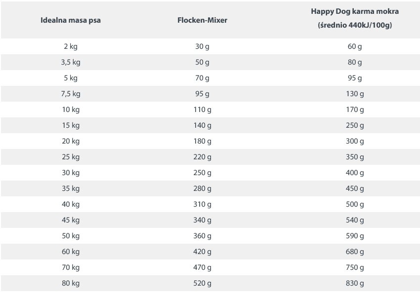 - Dostosowanie ilości karmy może być indywidualnie konieczne (przy produktach karm suchych o niższej zawartości energii należy zwiększyć ilość karmy, przy produktach o wyższej zawartości energii należy nieco zmniejszyć ilość karmy).