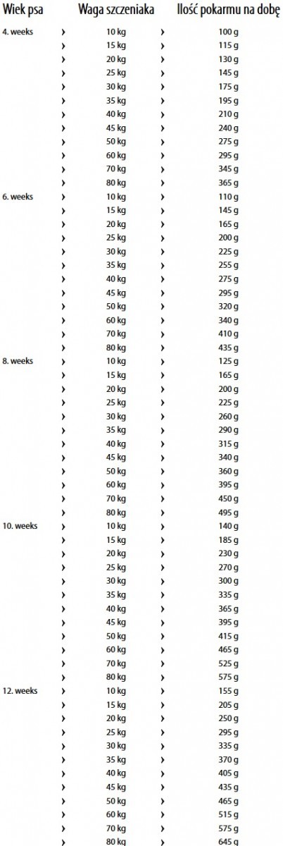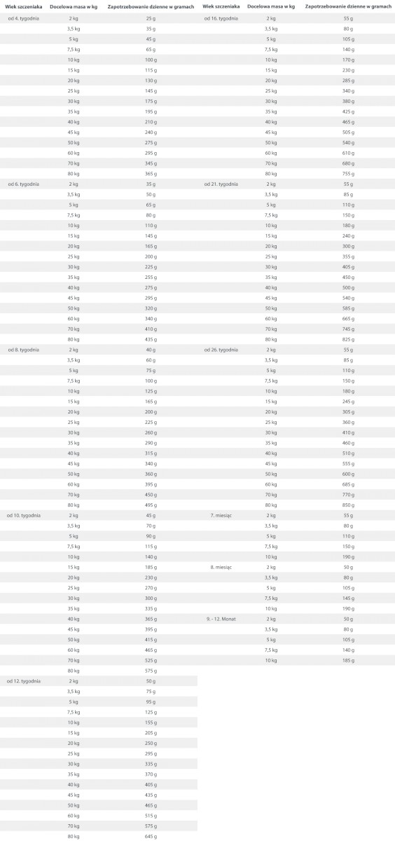 - Z uwagi na indywidualne potrzeby szczeniąt, powyżej podane ilości można zawyżyć lub zaniżyć o maksymalnie 15%.