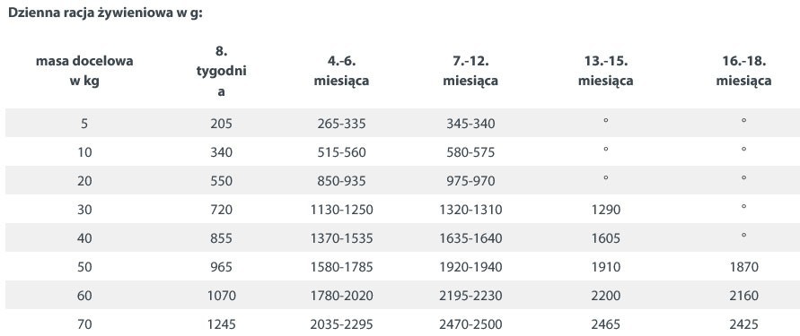 * Masa docelowa osiągnięta. Należy stopniowo przejść na odpowiednią karmę dla dorosłych.