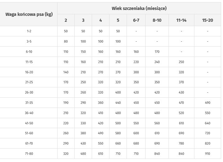 - Podana ilość ma charakter orientacyjny. Ilość karmy należy dostosować do wieku, rasy i aktywności.
