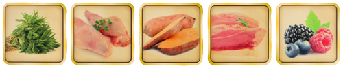 Dziczyzna 49% (w tym bażant świeży 13%, kaczka świeża 10%, mięso królika świeże 10%, suszone mięso kaczki 6%, suszone mięso bawołu 5%, tłuszcz z kaczki 5%), ziemniaki 13%, bataty 9%, groch, dynia, ciecierzyca, minerały, pasternak, koper włoski, topinambur, tymianek 0,1%, majeranek, oregano, pietruszka, szałwia, siemię lniane, pomidory, jeżyna 0,1%, malina 0,1%, czarna jagoda 0,1%, czarna porzeczka, bez czarny, aronia, algi morskie, szpinak, burak, głóg, lubczyk, żeń-szeń, mannooligosacharydy (MOS), fruktooligosacharydy (FOS), ekstrakt z Yucca Schidigera