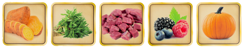 Świeże mięso renifera 52%, słodkie ziemniaki 25%, suszona konina, białko grochu, dynia 3%, pasternak, przecier pomidorowy, koper włoski, tłuszcz koński, topinambur, tymianek, majeranek, oregano, pietruszka, szałwia, szpinak, minerały, marchew, jeżyna 0,1%, malina 0,1%, czarna jagoda 0,1%, czarna porzeczka, bez czarny, aronia, algi morskie, siemię lniane, burak, fasola zielona, pokrzywa, głóg, żeń-szeń, mięta pieprzowa, aksamitka, borówka brusznica, mniszek 0,1%, MOS, FOS, wyciąg z Yucca Schidigera.