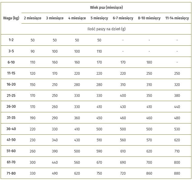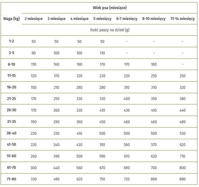 - Podana ilość ma charakter orientacyjny. Ilość karmy należy dostosować do wieku, rasy i aktywności.