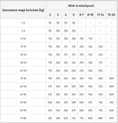 - Podana ilość ma charakter orientacyjny. Ilość karmy należy dostosować do wieku, rasy i aktywności.