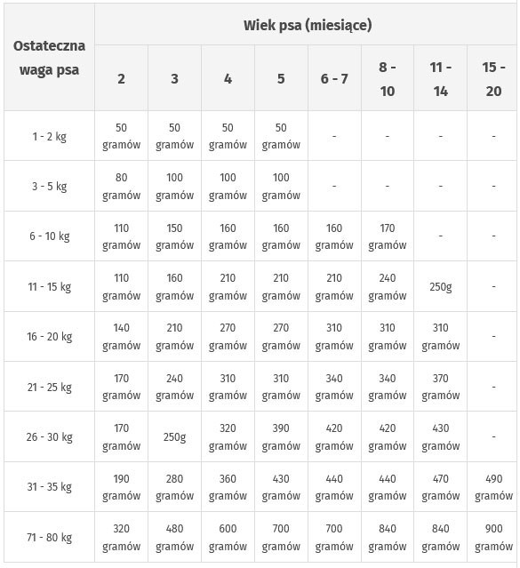 - Podana ilość ma charakter orientacyjny. Ilość karmy należy dostosować do wieku, rasy i aktywności.
