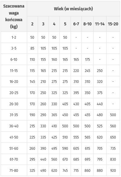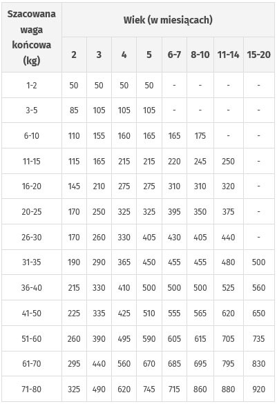 - Podana ilość ma charakter orientacyjny. Ilość karmy należy dostosować do wieku, rasy i aktywności.