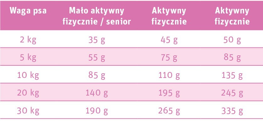 - Zalecana ilość karmy jest podawana na zwierzę dziennie w oparciu o docelową wagę dorosłego osobnika.