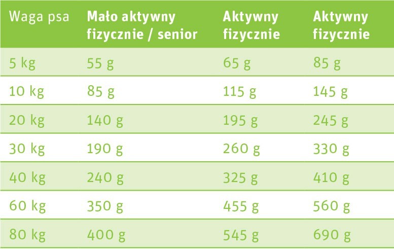 - Należy pamiętać, że podane ilości są jedynie wskazówkami i muszą być dostosowane do stanu odżywienia zwierzęcia i jego aktywności.