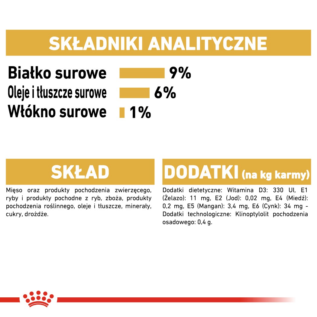 Białko surowe: 9% - Oleje i tłuszcze surowe: 6% - Popiół surowy: 1,9% - Włókno surowe: 1% - Wilgotność: 78,5%.
