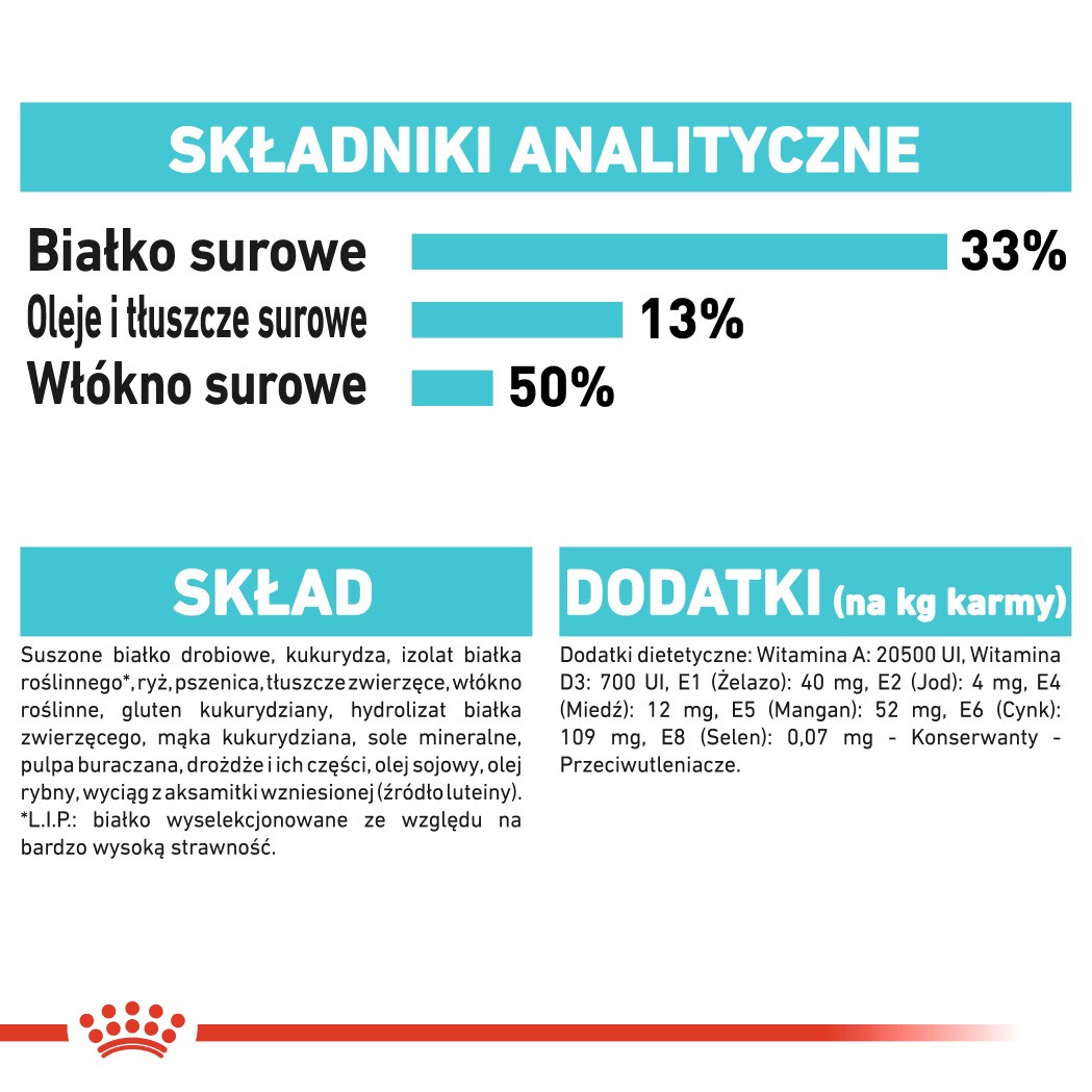 Skład: suszone białko drobiowe, kukurydza, izolat białka roślinnego*, ryż, pszenica, tłuszcze zwierzęce, włókno roślinne, gluten kukurydziany, hydrolizat białka zwierzęcego, mąka kukurydziana, sole mineralne, pulpa buraczana, drożdże i ich części, olej sojowy, olej rybny, wyciąg z aksamitki wzniesionej (źródło luteiny).