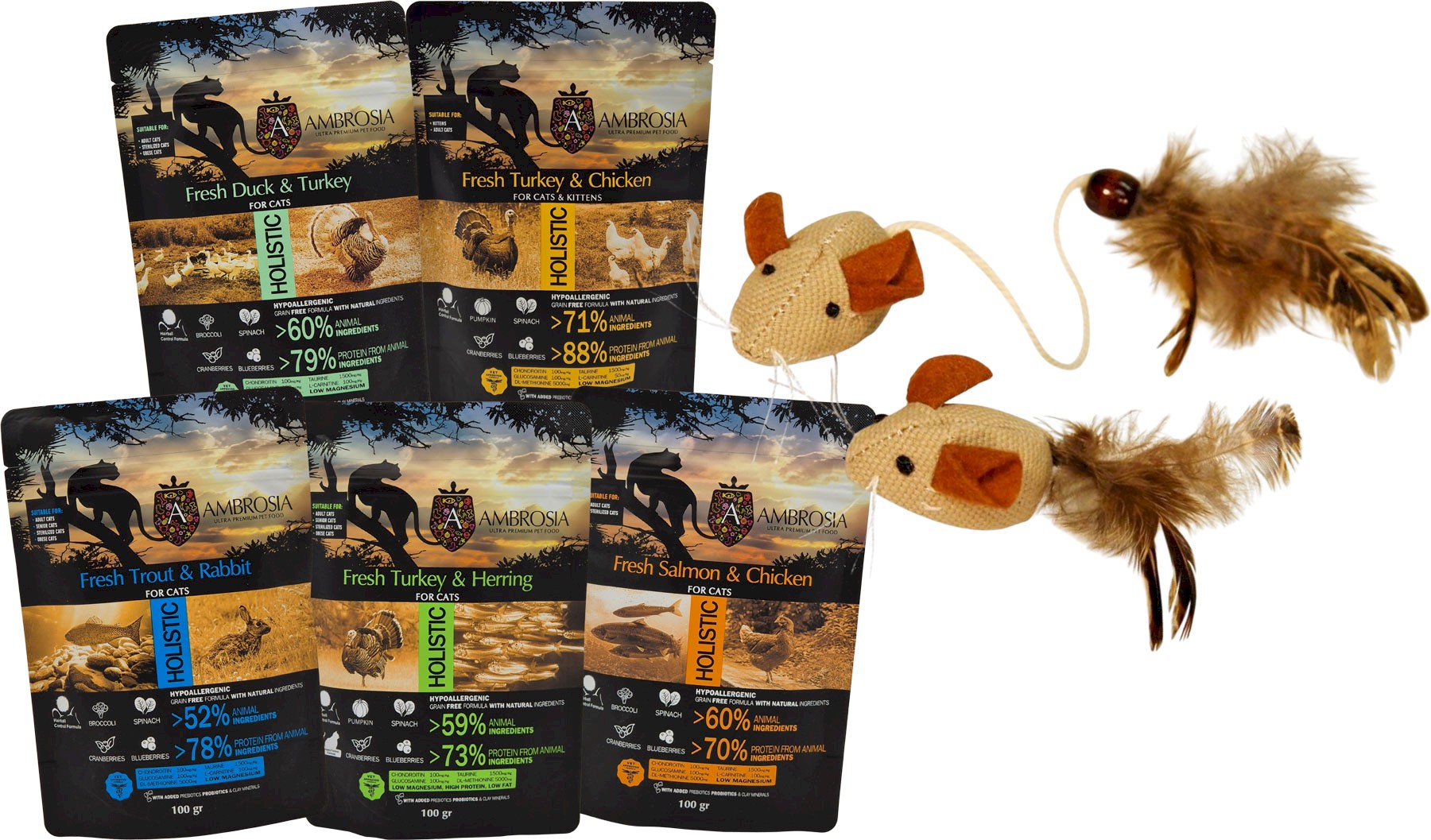 Pytanie o produkt AMBROSIA Cat Zestaw Startowy dla kota 5 x 100g + Zabawka: