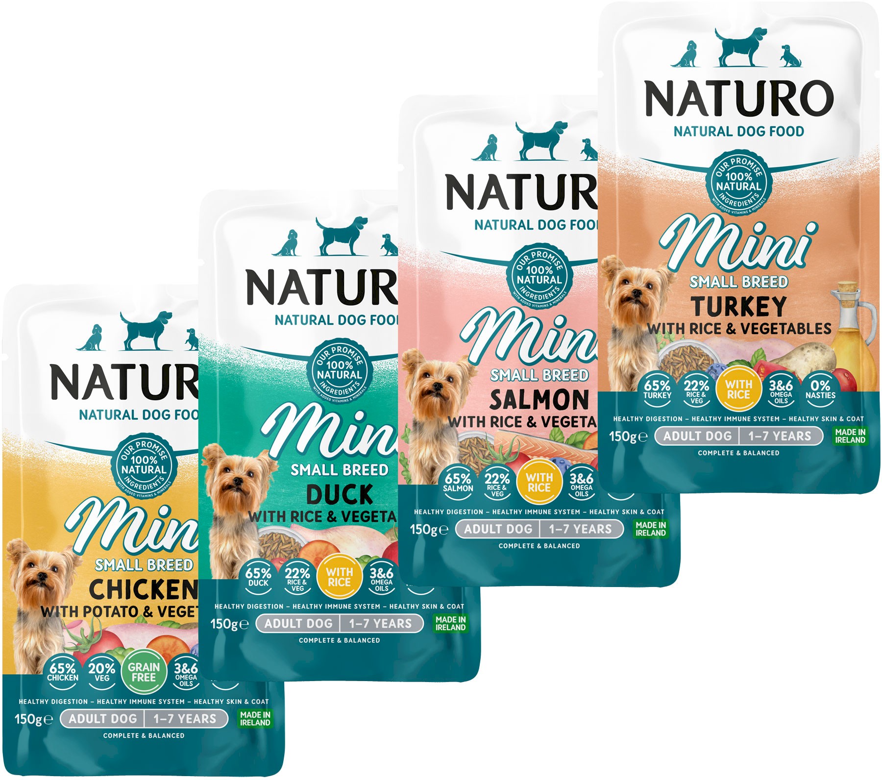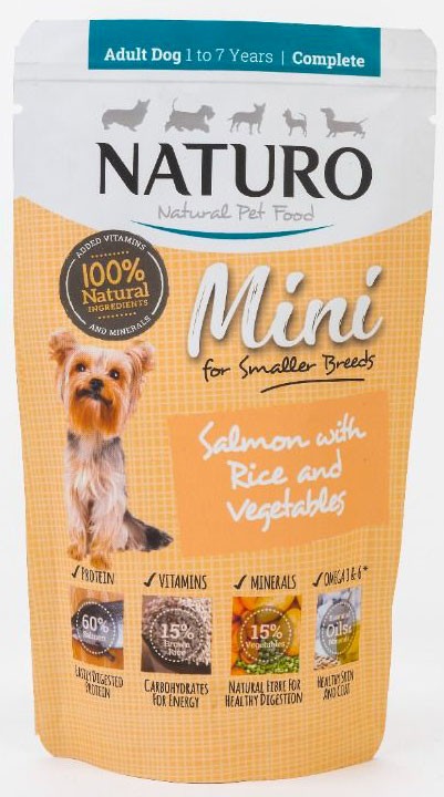 Cechy saszetki karmy NATURO Adult Dog Mini Salmon with Rice and Vegetables: |