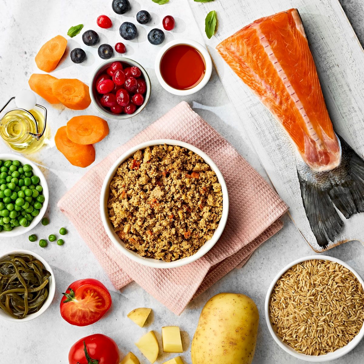 łosoś 60%, brązowy ryż 15%, marchew 5%, groszek 5%, ziemniaki 5%, minerały, olej słonecznikowy, olej z łososia, suszone pomidory, suszone wodorosty morskie, suszona bazylia.