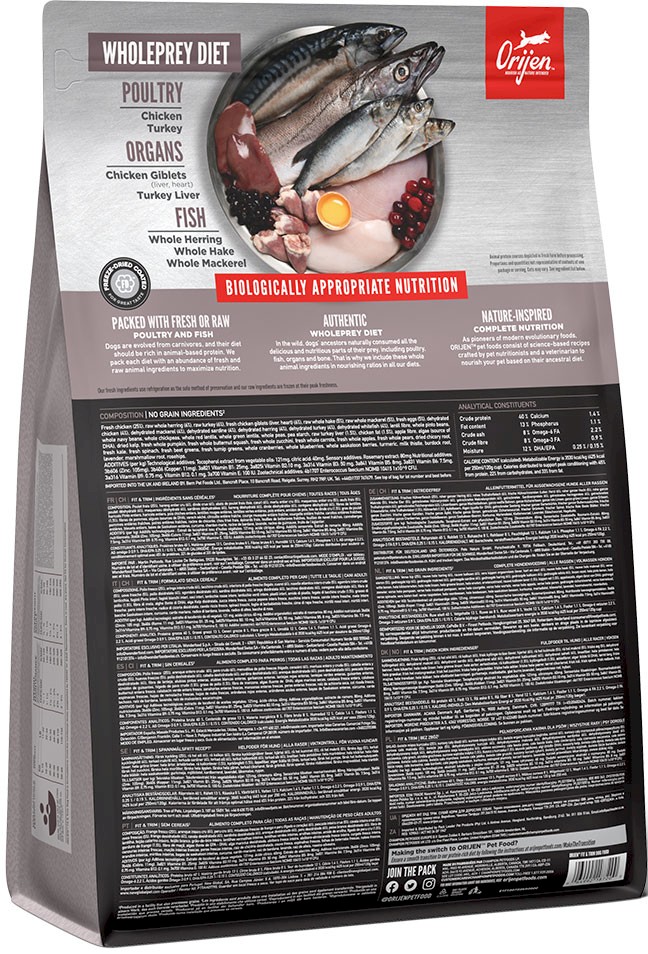 Świeże mięso kurczaka (14%), świeże całe jaja (6%), świeży cały śledź (6%), świeże mięso indyka (6%), świeża wątroba kurczaka (6%), świeża cała flądra (4%), świeża cała makrela (4%), świeży cały morszczuk (4%), świeża wątroba indyka (4%), świeże serce kurczaka (4%), kurczak (dehydratyzowany, 4%), indyk (dehydratyzowany, 4%), cała makrela (dehydratyzowana, 4%), całe sardynki (dehydratyzowane, 4%), cały śledź (dehydratyzowany, 4%), mintaj (dehydratyzowany, 4%), włókno soczewicy, cała czerwona soczewica, cała zielona soczewica, cały goch zielony, cała ciecierzyca, cały groch żółty, cała fasola pinto, cała fasola biała, chrząstki kurczaka (dehydratyzowane, 1%), świeże serce indyka (1%), włókno jabłka, suszone algi (źródło DHA i EPA), dynia (dehydratyzowana), dynia piżmowa (dehydratyzowana), marchew (dehydratyzowana), wątroba kurczaka (liofilizowana), wątroba indyka (liofilizowana), świeża cała dynia, świeża cała dynia piżmowa, świeża cała cukinia, świeży cały pasternak, świeża marchew, świeże całe jabłka red delicious, świeże całe gruszki bartlett, świeży jarmuż, świeży szpinak, świeże liście buraków, świeże liście rzepy, brązowy kelp, cała żurawina, całe borówki, całe jagody saskatoon, korzeń cykorii, kurkuma, ostropest plamisty, korzeń łopianu, kwiat lawendy, korzeń prawoślazu lekarskiego, owoce dzikiej róży.