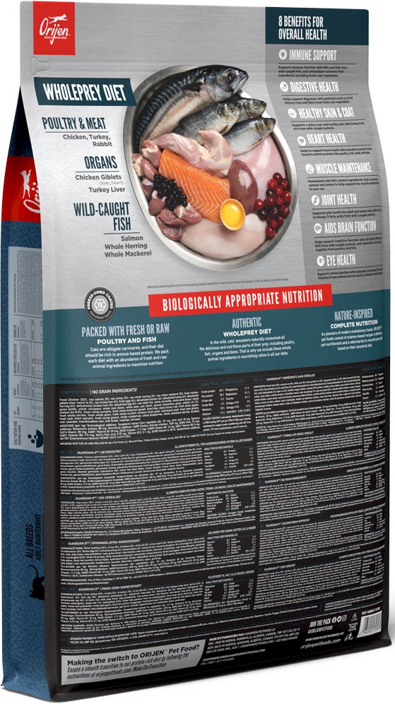 Świeże mięso kurczaka (32%), surowy łosoś (5%), surowe mięso indyka (5%), surowy cały śledź (5%), surowa cała makrela (5%), świeże organy kurczaka (wątroba, serce) (4,5%), surowa wątroba indyka (4%), świeże jaja (4%), dehydratyzowany kurczak (4%), dehydratyzowany indyk (4%), dehydratyzowany śledź (4%), dehydratyzowana wątroba kurczaka (4%), dehydratyzowane jaja (4%), surowe mięso królika (4%), cała czerwona soczewica, cała fasola pinto, cała zielona soczewica, cała ciecierzyca, cała fasola biała, cały groch, skrobia grochowa, zmielona trawa miskant, olej z rdzawca (1%), tłuszcz z kurczaka (0,5%), świeża cała dynia, świeża cała dynia piżmowa, suszony kelp, suszony korzeń cykorii, świeże całe jabłka, świeża cała marchew, świeże całe gruszki, świeża cała cukinia, suszone drożdże browarnicze, hydrolizowane drożdże, świeże liście buraków, świeży jarmuż, świeży szpinak, świeże liście rzepy, cała żurawina, całe borówki, całe jagody saskatoon, korzeń łopianu, lawenda, korzeń prawoślazu lekarskiego, ostropest plamisty, owoce dzikiej róży, kurkuma.
