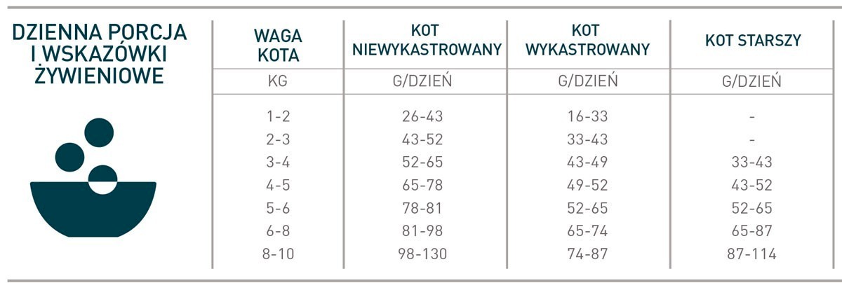 - Dlatego proponujemy rozpocząć dawkowanie karmy zgodnie ze schematem poniżej, kontrolując wagę kota, a następnie dostosować porcję do jego potrzeb.