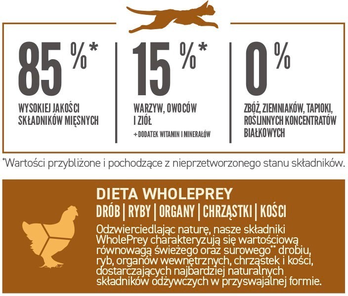 Świeże mięso kurczaka (20%), surowe mięso indyka (10%), surowy cały śledź (9%), świeże organy kurczaka (wątroba, serce) (6%), surowy cały morszczuk północnopacyficzny (5%), surowa wątroba indyka (5%), świeże jaja (5%), dehydratyzowany kurczak (4%), dehydratyzowany indyk (4%), dehydratyzowana makrela (4%), dehydratyzowana sardynka (4%), dehydratyzowany śledź (4%), tłuszcz z kurczaka (4%), cała czerwona soczewica, cały groch, cała zielona soczewica, cała ciecierzyca, włókno soczewicy, cała fasola pinto, skrobia grochowa, cała fasola biała, olej z rdzawca (1%), suszony kelp, świeża cała dynia, świeża cała dynia piżmowa, świeża cała cukinia, świeża cała marchew, świeże całe jabłka, świeże całe gruszki, suszony korzeń cykorii, świeży jarmuż, świeży szpinak, świeże liście buraków, świeże liście rzepy, cała żurawina, całe borówki, całe jagody saskatoon, kurkuma, ostropest plamisty, korzeń łopianu, lawenda, korzeń prawoślazu lekarskiego, owoce dzikiej róży. róży.