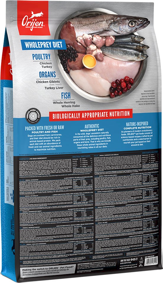 Świeże mięso kurczaka (13%), świeże mięso indyka (7%), świeże całe jaja (7%), świeża wątroba kurczaka (6%), świeży cały śledź (6%), świeża cała flądra (5%), świeża wątroba indyka (5%), świeża szyja kurczaka (4%), świeże serce kurczaka (4%), świeże serce indyka (4%), kurczak (dehydratyzowany, 4%), indyk (dehydratyzowany, 4%), cała makrela (dehydratyzowana, 4%), całe sardynki (dehydratyzowane, 4%), cały śledź (dehydratyzowany, 4%), cała czerwona soczewica, cała zielona soczewica, cały groch zielony, włókno soczewicy, cała ciecierzyca, cały groch żółty, cała fasola pinto, cała fasola biała, olej ze śledzia (1%), tłuszcz z kurczaka (1%), chrząstki kurczaka (1%), wątroba kurczaka (liofilizowana), wątroba indyka (liofilizowana), świeża cała dynia, świeża cała dynia piżmowa, świeża cała cukinia, świeży cały pasternak, świeża marchew, świeże całe jabłka red delicious, świeże całe gruszki bartlett, świeży jarmuż, świeży szpinak, świeże liście buraków, świeże liście rzepy, brązowy kelp, cała żurawina, całe borówki, całe jagody saskatoon, korzeń cykorii, kurkuma, ostropest plamisty, korzeń łopianu, kwiat lawendy, korzeń prawoślazu lekarskiego, owoce dzikiej róży.