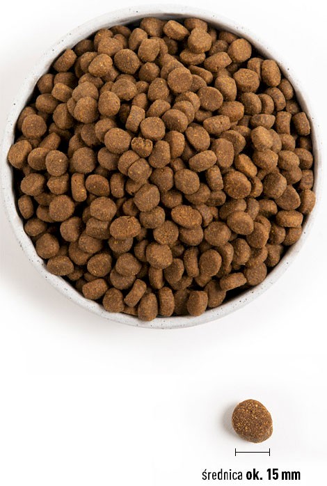 Składniki analityczne: Białko surowe (min.) 38%, Oleje i tłuszcze surowe (min.) 16%, Popiół surowy (max.) 8%, Włókno surowe (max.) 6%, Wilgotność (max.) 10%, Wapń (min.) 1.2-1,5%, Fosfor (min.) 1-1,3%, Omega 6 (min.) 2,6%, Omega 3 (min.) 1%, EPA (min.) 0,3%, DHA (min.) 0.6%, Glukozamina (min.) 1400 mg/kg, Siarczan chondroityny (min.) 1200 mg/kg