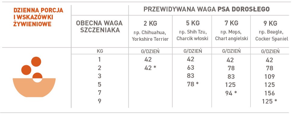 | Waga szczeniaka | Ilość w gramach na dzień Przewidywana waga psa dorosłego |