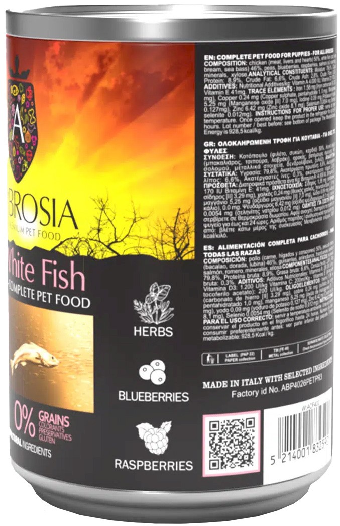 - Ambrosia to zdrowa i naturalna karma, w której ziarna tych zbóż, GMO i konserwanty nie zostały włączone do żadnego z produku.