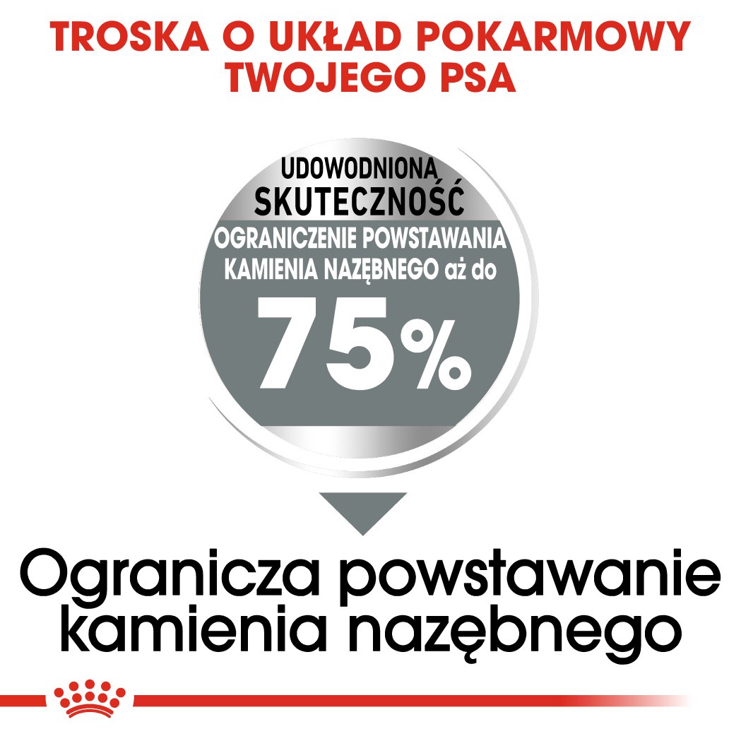 Unikalne parametry krokietów i specjalna tekstura, opracowana w Centrum Badań i Rozwoju Royal Canin, pozwalają na usuwanie osadu z powierzchni zęba w momencie, gdy pies rozgryza karmę.
