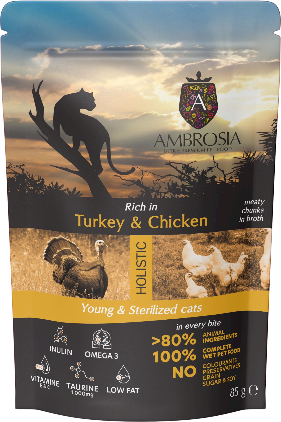 AMBROSIA Cat Young / Sterilised Turkey / Chicken Indyk i Kurczak 85g