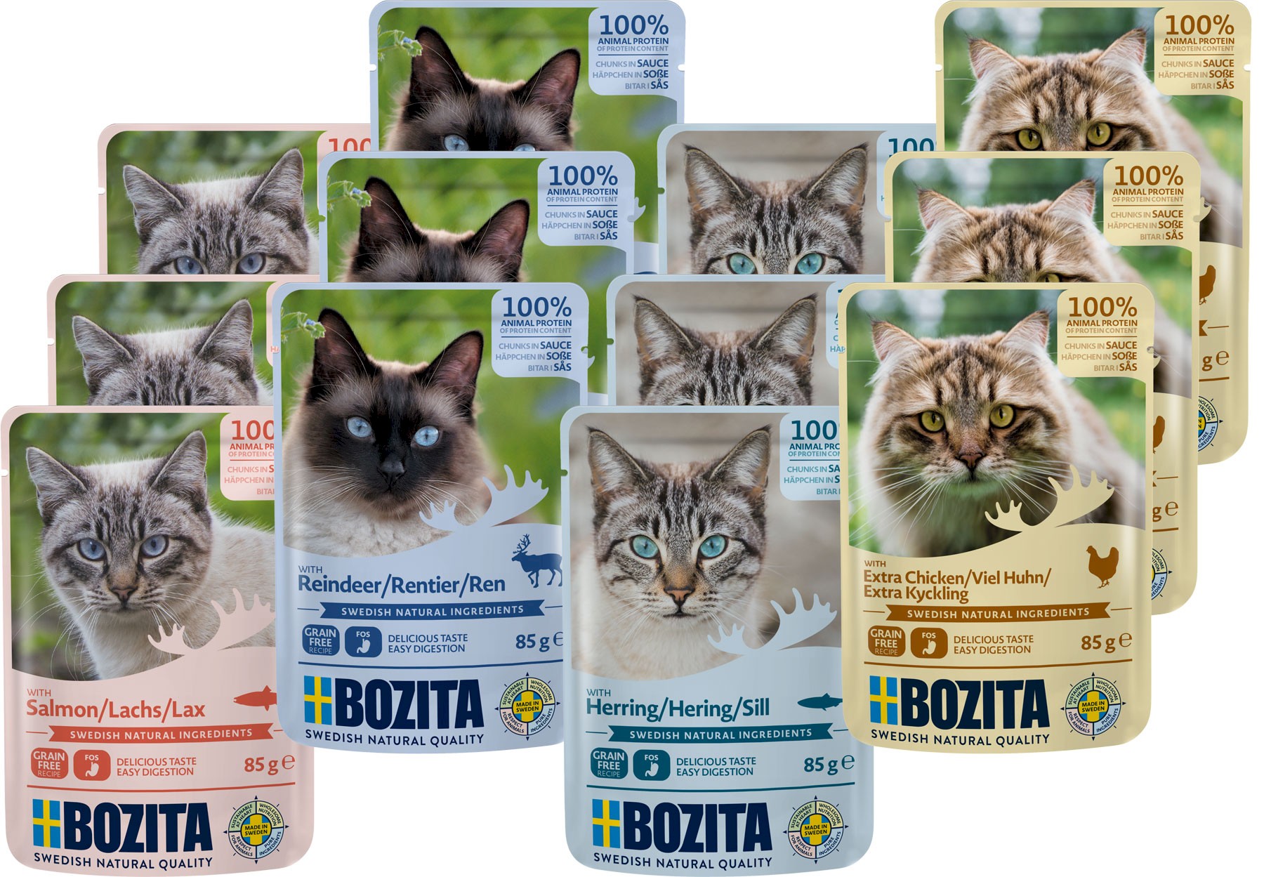 Cechy karmy dla kota BOZITA Chunks in Sauce Tasty Meat & Fish Menu Grain Free Recipe :