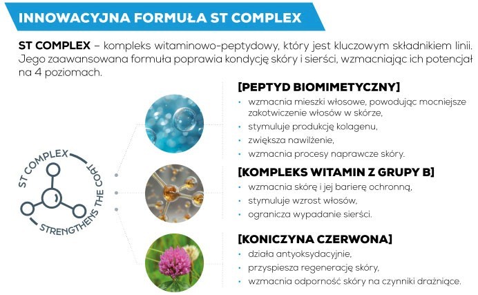 - ✅ Wzmacnia i regeneruje sierść – ST COMPLEX poprawia kondycję włosa i skóry.