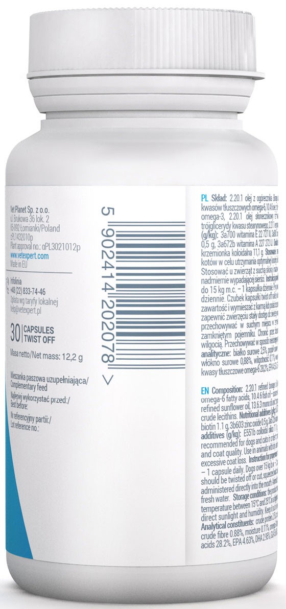 - Preparat wspomagający przeznaczony dla psów i kotów z zaburzeniami dermatologicznymi, objawiającymi się suchą, matową, wypadającą sierścią oraz łuszczącą się skórą.