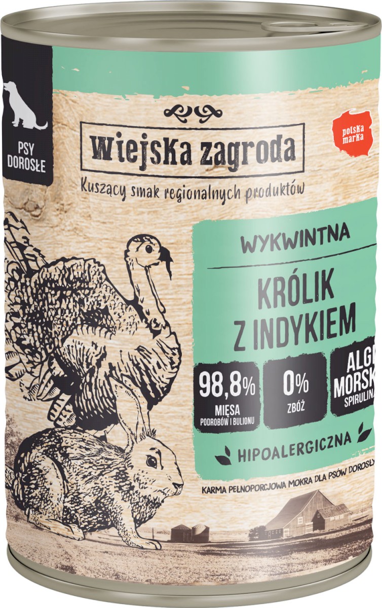 Cechy puszki dla psa Wiejska Zagroda Królik z Indykiem bez zbóż: |