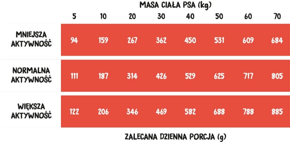 - Świeży olej z łososia - bogactwo kwasów tłuszczowych Omega 3 EPA i DHA, cennych dla sierści i skóry Twojego psa, dodawany próżniowo na samym końcu.
